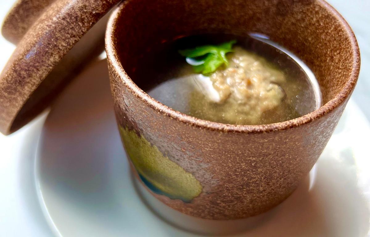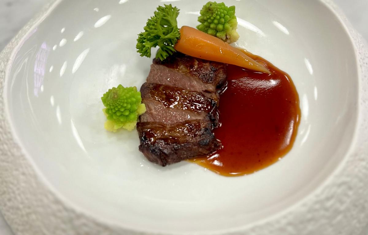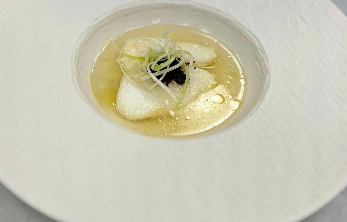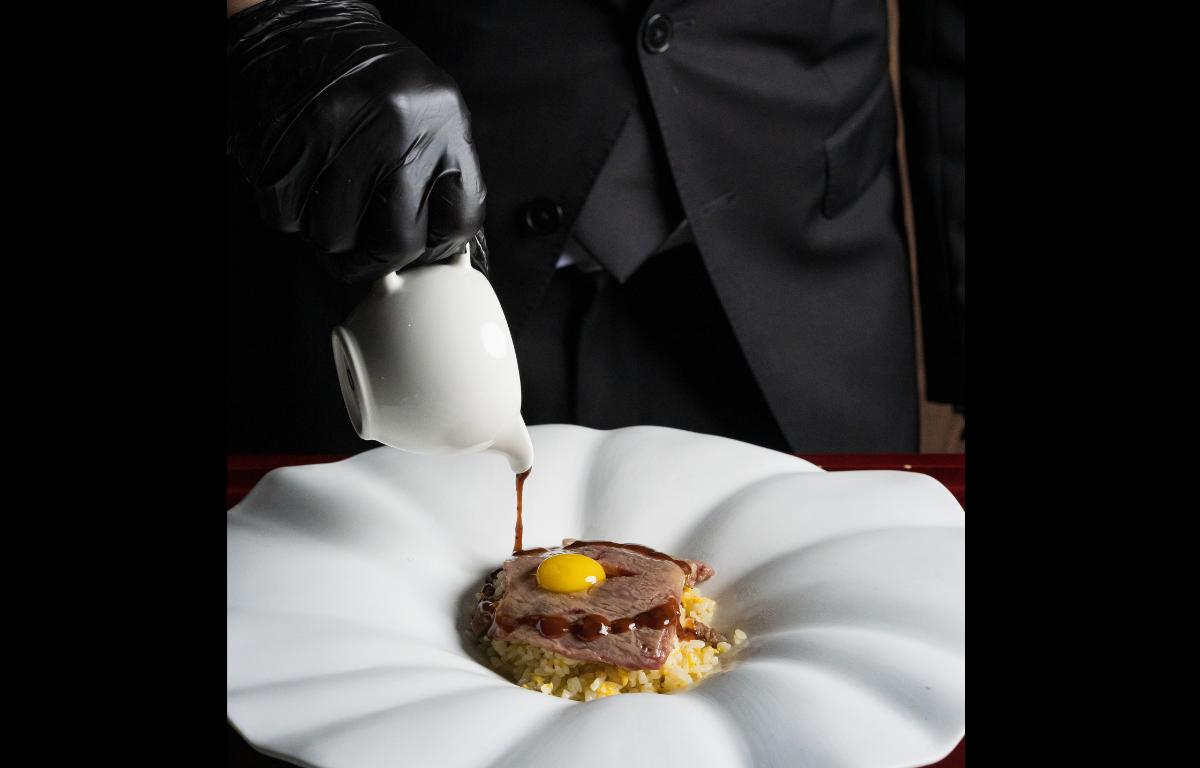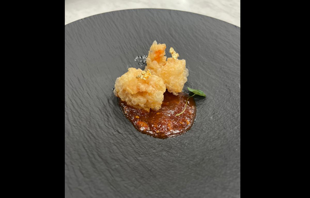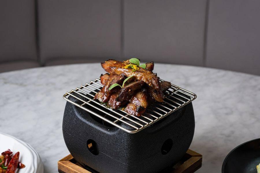 Our BBQ Iberico 'Char Siu' is made with pork sourced from the Iberian Peninsula. We have chosen this breed of pork for its distinctive flavor, low fat, and tender meat. This dish is served on a live charcoal grill, glazed with a thin layer of Osmathus honey and apple smoke.