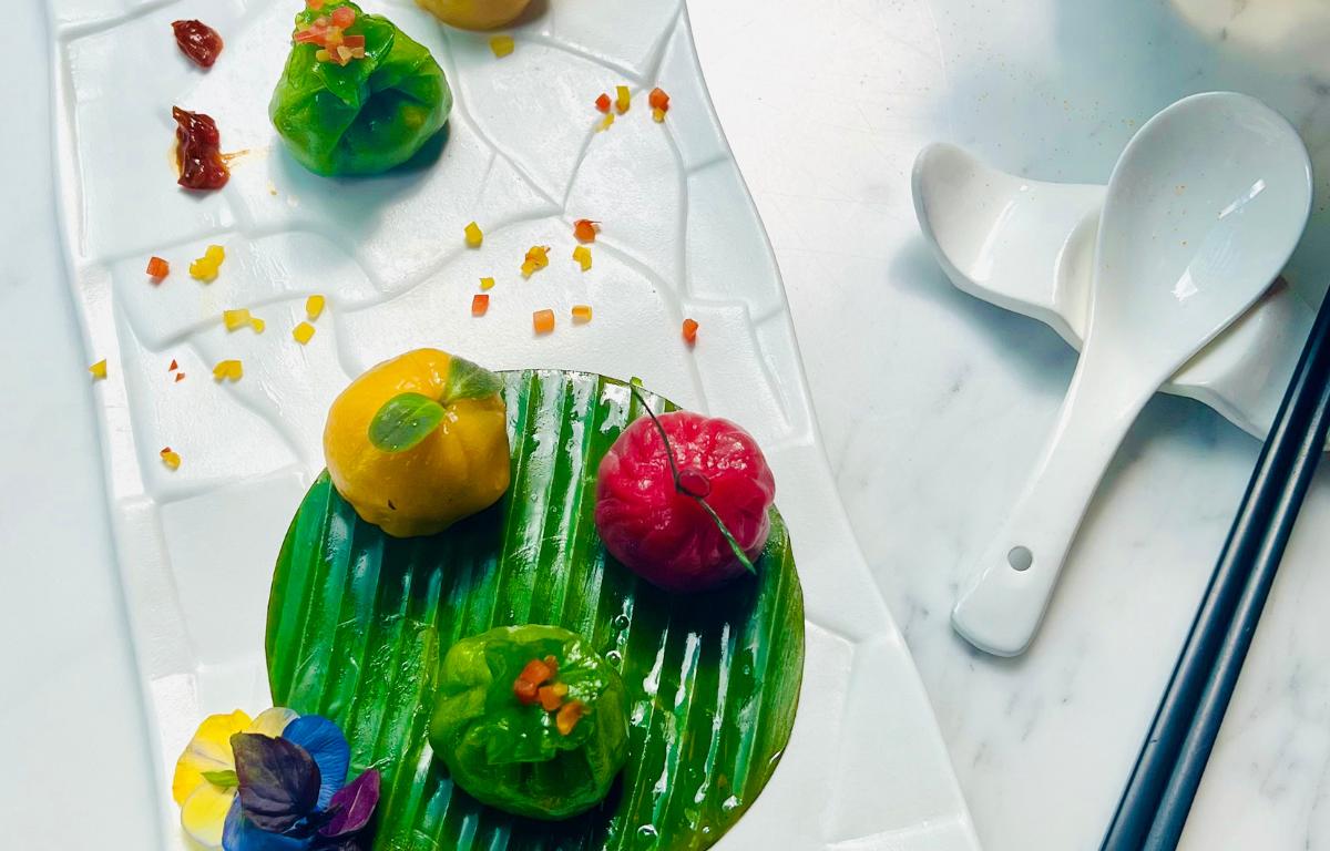 Our Fresh Rainbow Crab & Prawn Dumplings are handmade daily, using the highest quality blue crab and prawns. The wrapping takes its distinctive purple color from fresh beetroot, enveloping the ingredients into a unique triangular shape. Each dumpling is garnished with Tobiko Caviar and served in a bamboo basket.