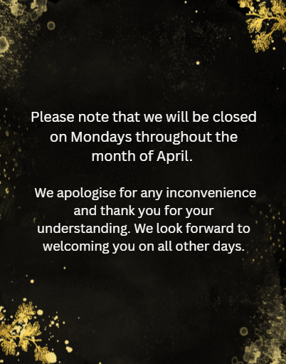 Please note that we will continue to be closed on Monday on Sunday throughout the month of April!